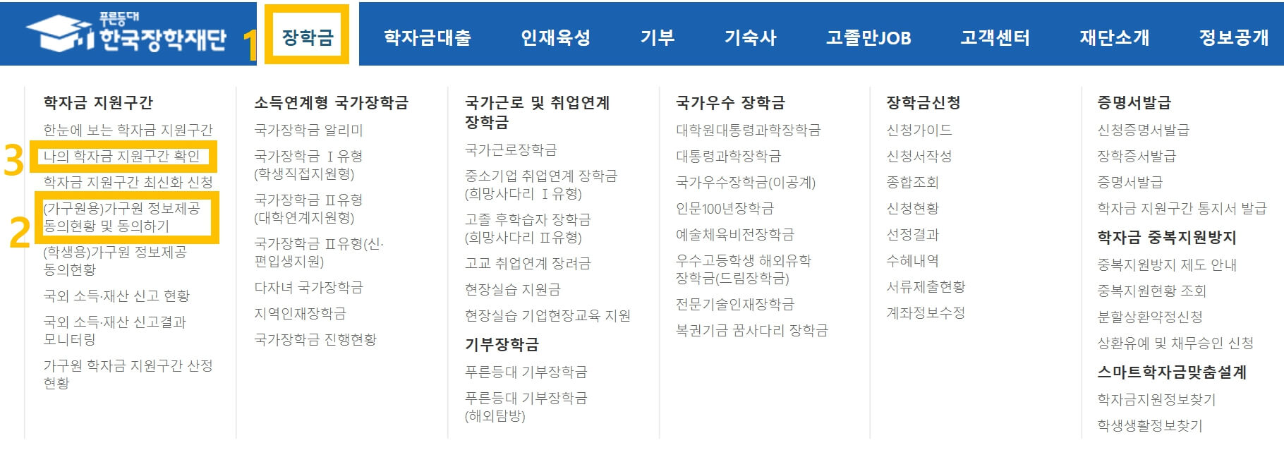 ① 상단 메뉴에서 장학금 메뉴를 누릅니다